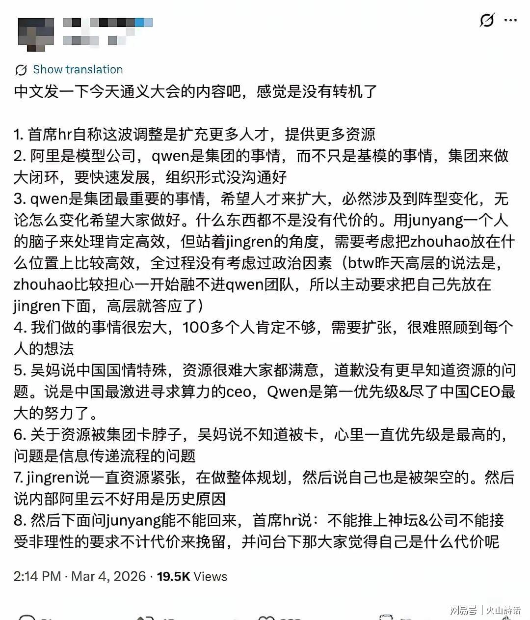 3、qwen是集团最重要的事情,希望人才来扩大,必然涉及到阵型变化,无论怎么变化希望大家做好。什么东西都不是没有代价的。用junyang一个人的脑子来处理肯定高效,但站着jingren的角度,需要考虑把zhouhao放在什么位置上比较高效,全过程没有考虑过政治因素(btw昨天高层的说法是,zhouhao比较担心一开始融不进qwen团队,所以主动要求把自己先放在jingren下面,高层就答应了)